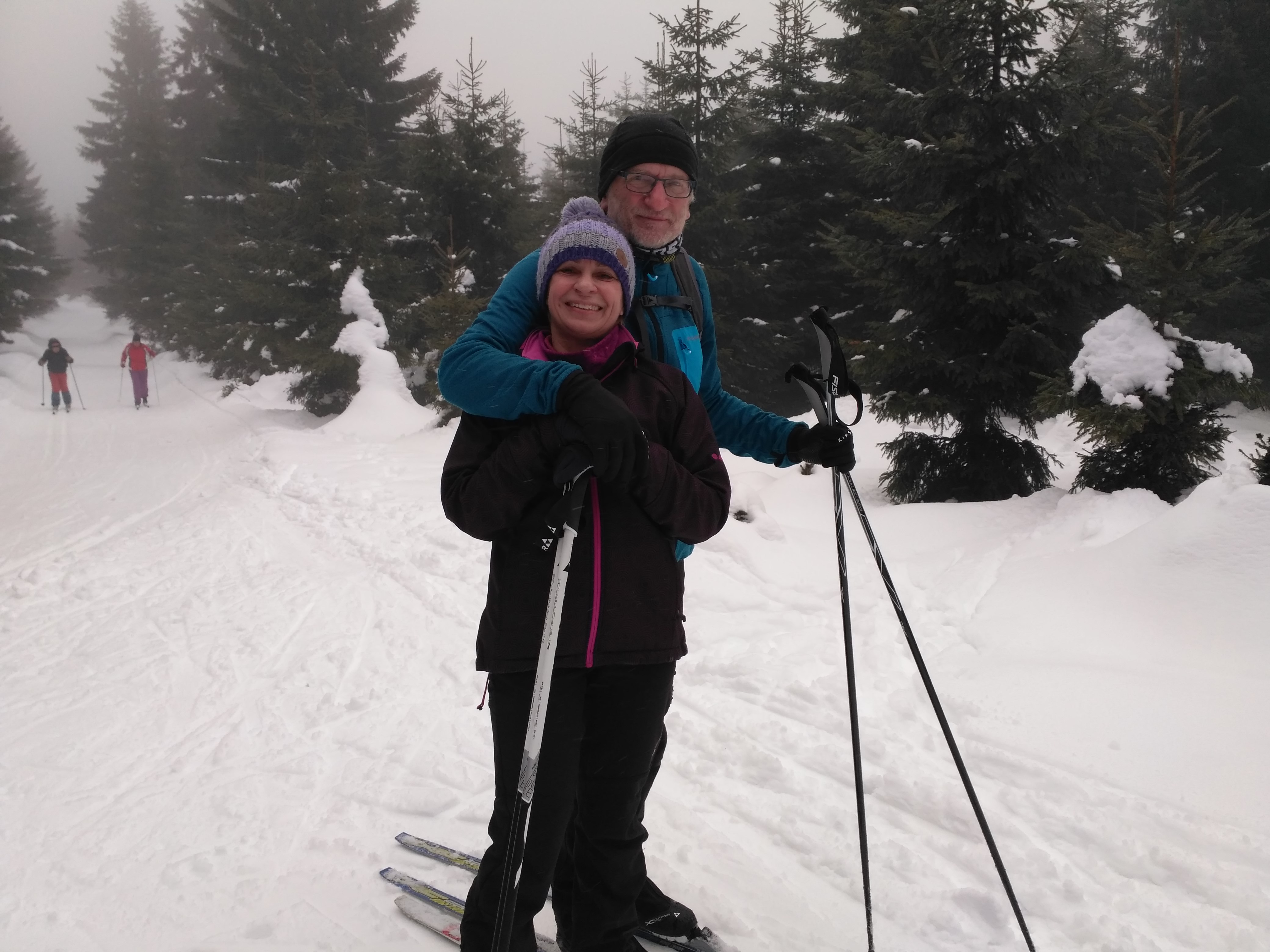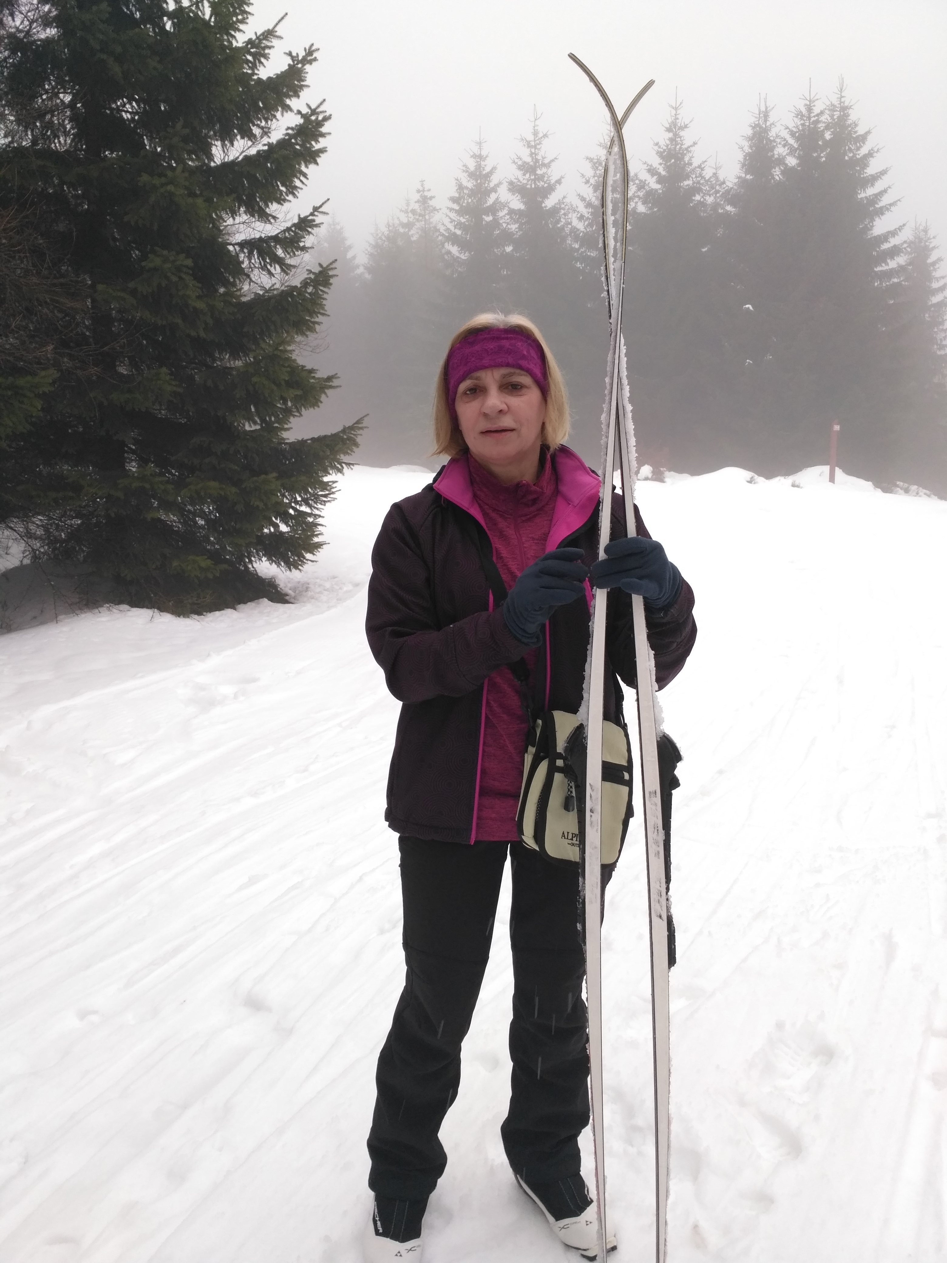 W Gierałtowie jest nas co roku dużo. Każdy znajduje coś dla siebie – narty zjazdowe w Lądku, na Czarnej Górze i w Czechach, zwiedzanie okolic, wędrówki po górach, słodkie leniuchowanie… My oczywiście bardzo czekaliśmy na biegówki. Jeździmy w piątkę – ja, Tomek, Kaczor, Paulina i Gomółek, dołączają też Minia, Gonia i Witek. Na parkingu w lesie, tuż za Bielicami sporo samochodów – i to pierwsza niespodzianka. Z dnia na dzień będzie ich coraz więcej, na polanie będzie prawdziwy tłok, choć miejsca tam naprawdę dużo. Droga z Bielic do parkingu wyboista i śliska, ale na szczęście ruszy pług, by ją nieco wyrównać. I już tu można założyć narty. Szlaki prowadzące na grań – w stronę na Suchą Przełęcz, do granicy i do Paprska przygotowane. Ślad założony przez ratrak pozwala na to, by już od parkingu ruszyć w górę na nartach. Przez wiele lat prawie zawsze trzeba było podchodzić z nartami na ramieniu, a nawet jeśli był śnieg, to drogę rozjeżdżały ciągniki. Teraz prawdziwy luksus. W obawie o stan nart pierwszego dnia zabraliśmy stary sprzęt. Zupełnie niepotrzebnie.
