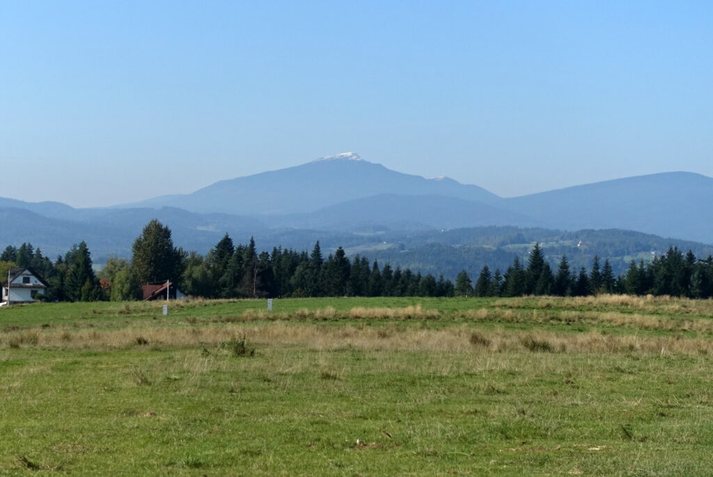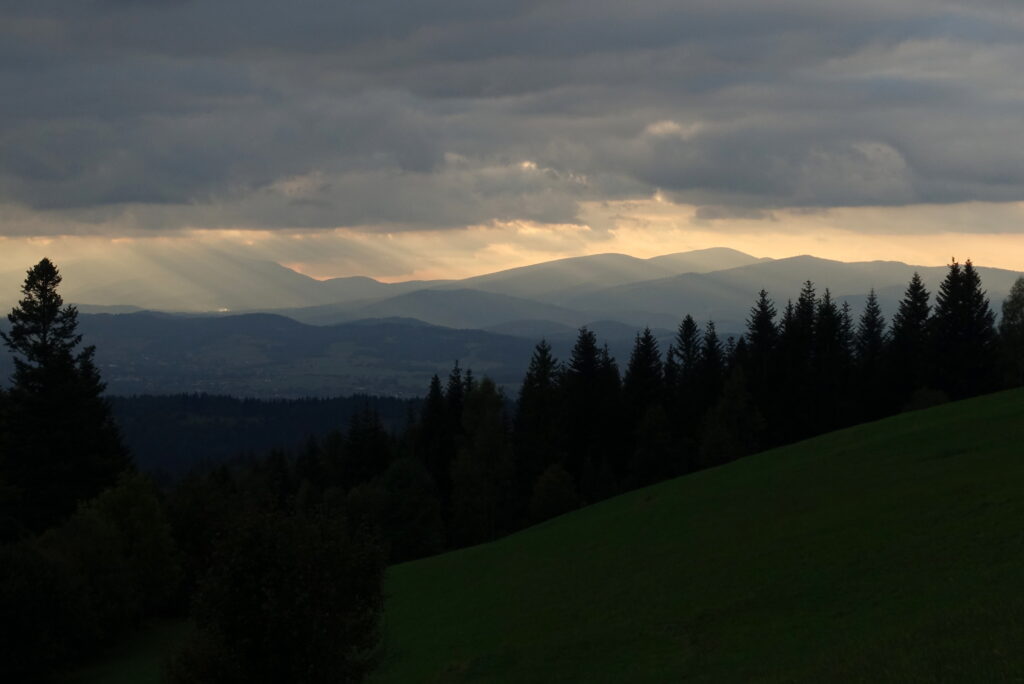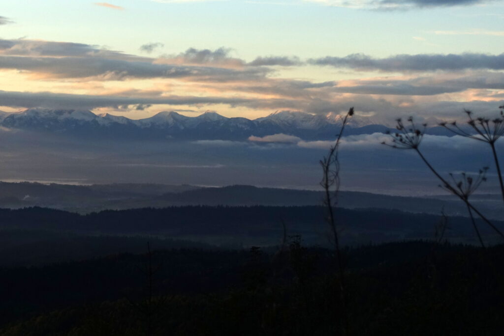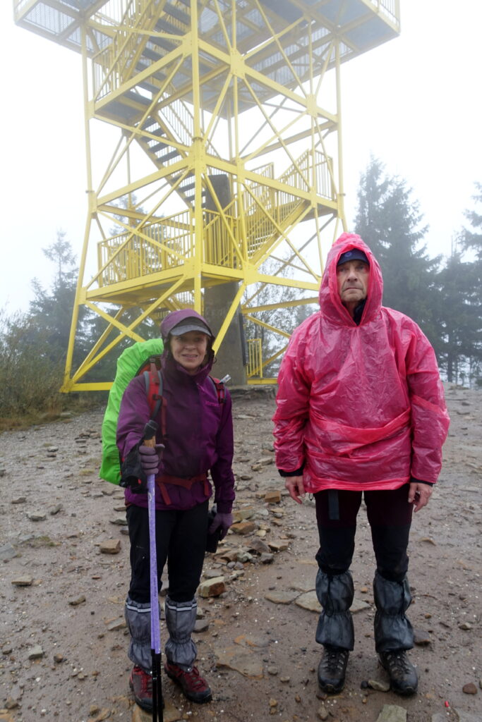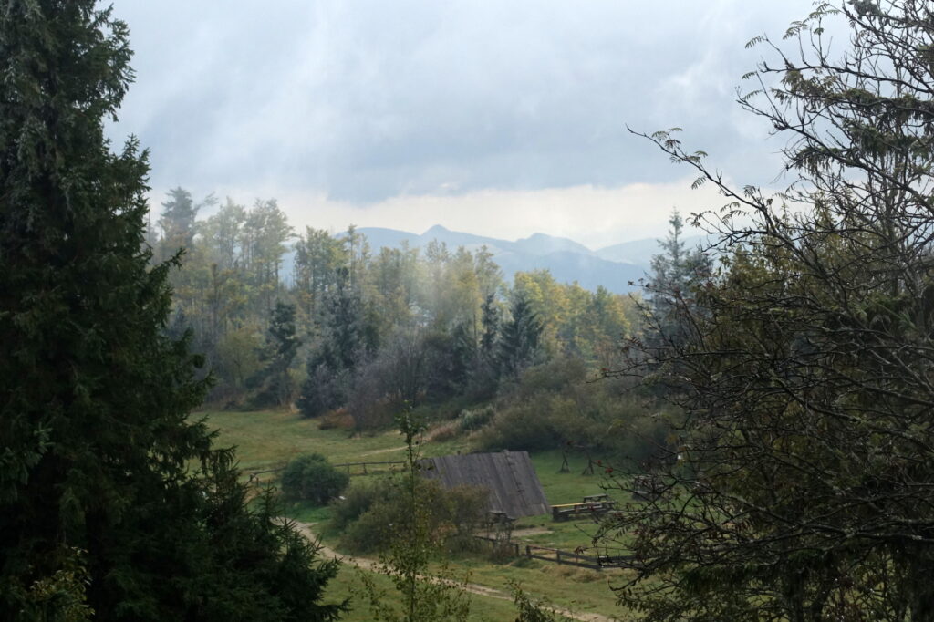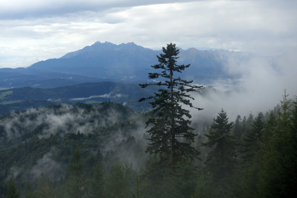 Na Przehybie po porannym deszczu chmury się nieco rozstąpiły, odsłaniając Tatry na horyzoncie. Był to jeden z nielicznych widoków tego pochmurnego i deszczowego przełomu lata i jesieni. Większość wież widokowych na trasie tonęła w chmurach i mgle, więc zwykle przechodziliśmy obok, nie korzystając z tej atrakcji.
