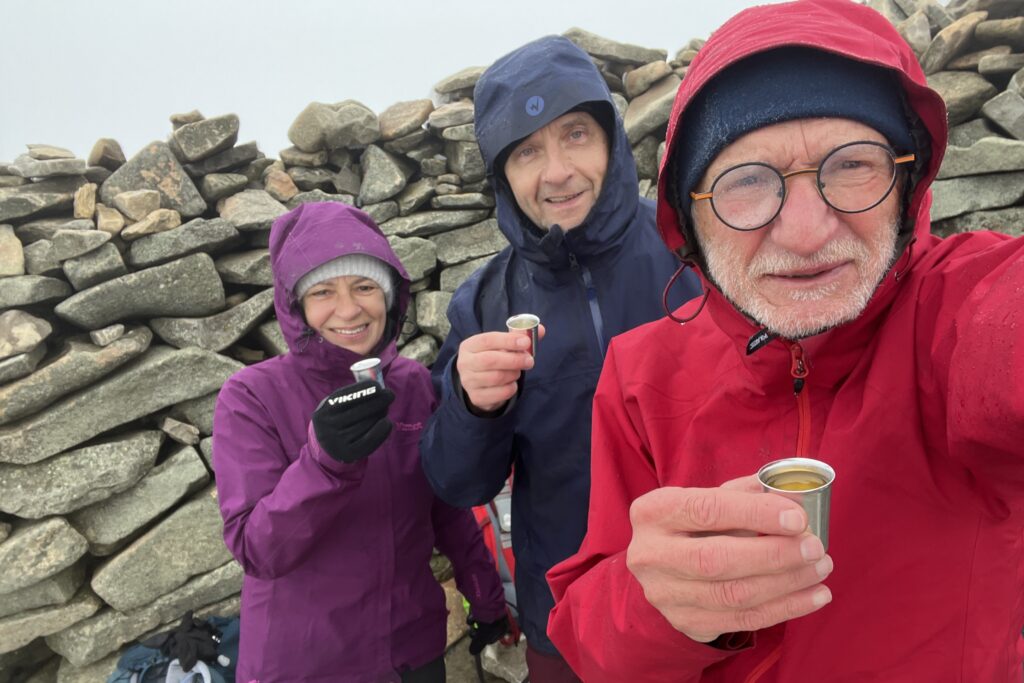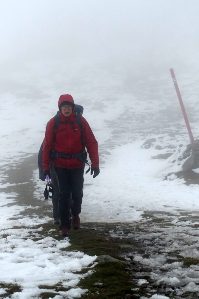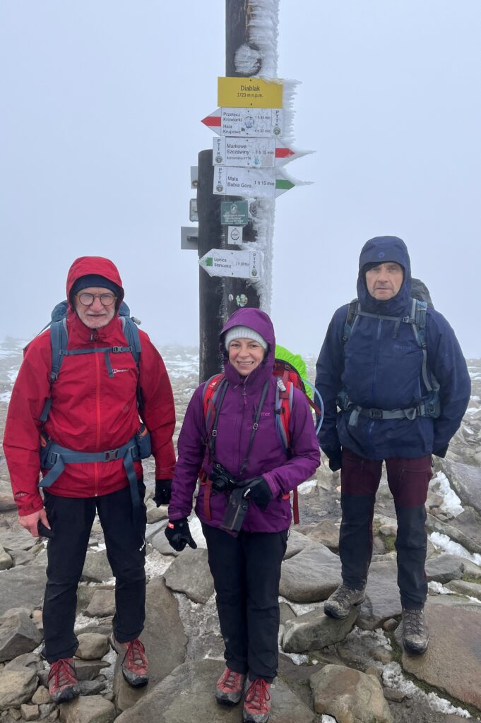 Wejście na Babią Górę zawsze robi wrażenie, szczególne w warunkach zimowych, przy temperaturze około 0 stopni i silnym wietrze. Ale osiągamy najwyższy punkt naszej czterotygodniowej wędrówki, więc toast jest niezbędny. Jedynie dłonie bardzo marzną po zdjęciu mokrych rękawic.