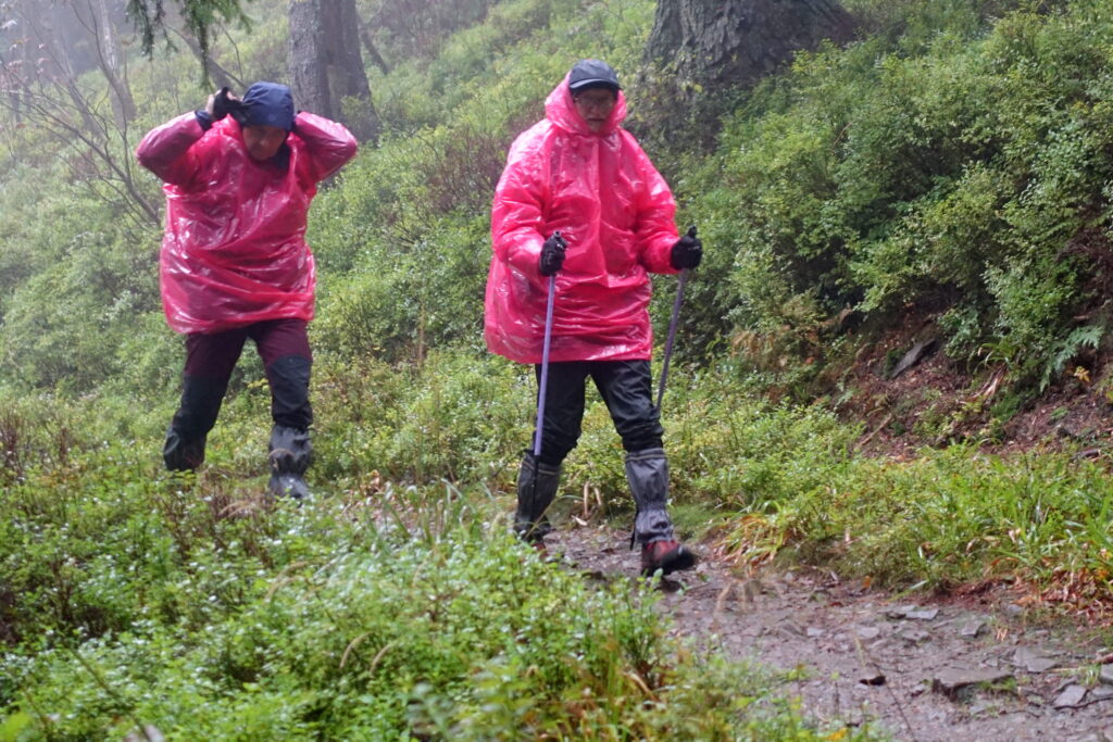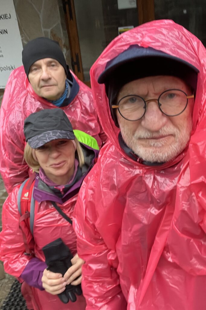 Z Markowych Szczawin wychodzimy w deszczu, który ma padać bez przerwy przez dwa dni, więc w schronisku zaopatrujemy się w gustowne, różowe peleryny. Zatrzymujemy się na przełęczy Glinne przy słowackim sklepie, jedynym na szlaku między Bystrą a Węgierską Górką. Rozgrzewamy się tuż obok, w słowackiej restauracji.