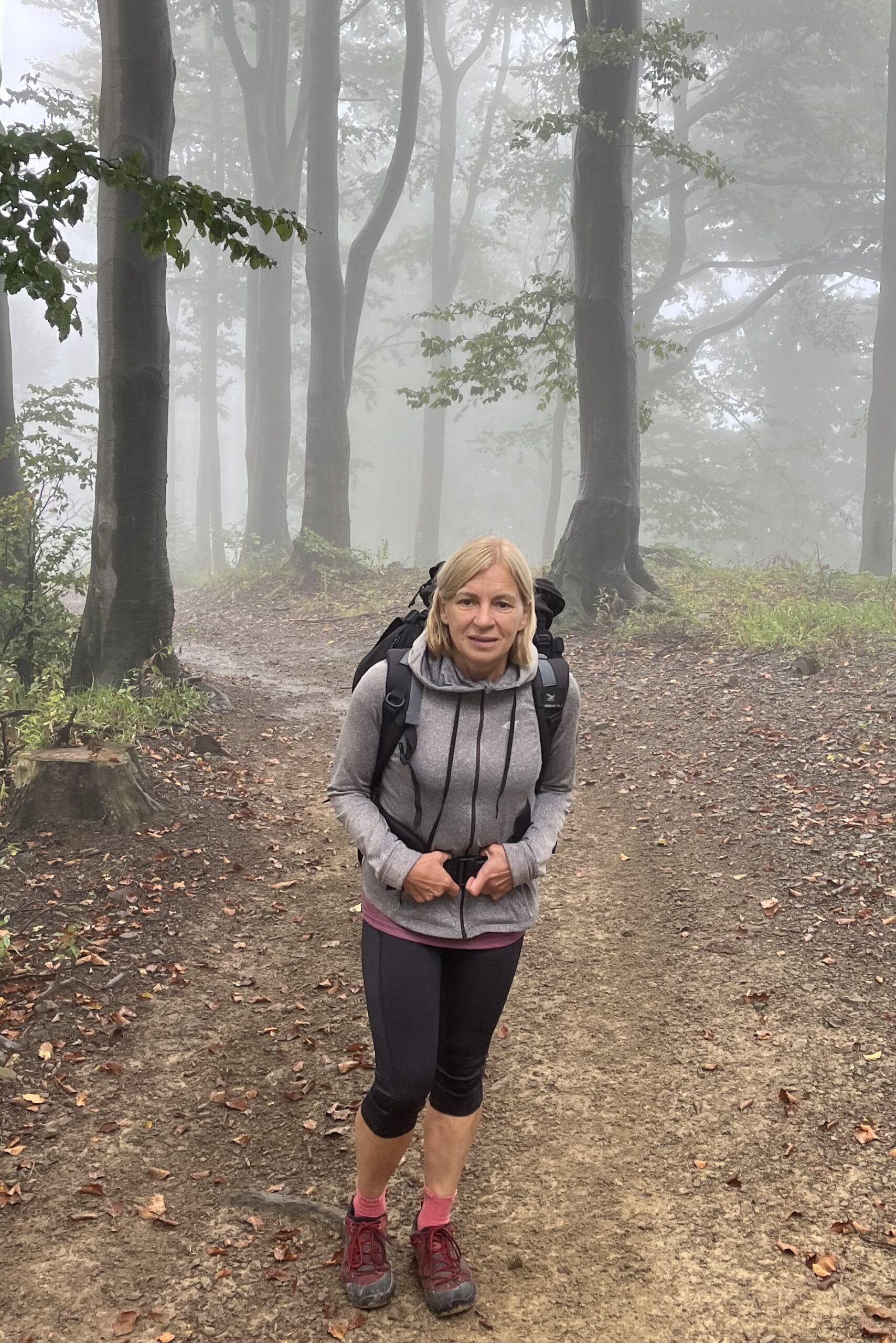 Przed nami ostatnie pasmo górskie, ostatnie dni i ostatni akord wyprawy. Zaczynamy od długiego podejścia na Baranią Górę (1220 m), drugi po Skrzycznem pod względem wysokości szczyt w Beskidzie Śląskim. Na górze znajduje się kolejna wieża widokowa, na którą patrzymy bez żalu, przechodząc obok. Chmury i mgła zmieniająca się w mżawkę sprawiają, że wejście na wieżę okazuje się znów bezcelowe.