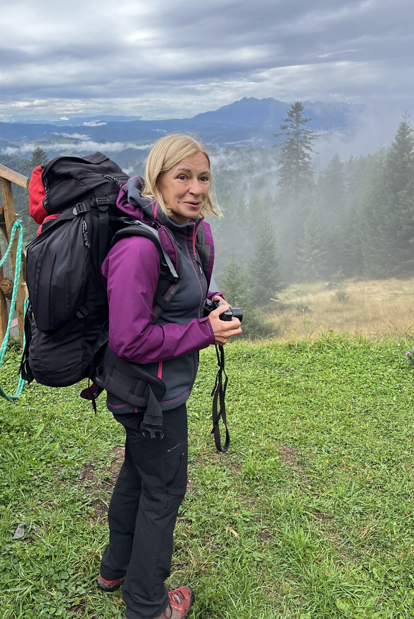 Z Markowych Szczawin wychodzimy w deszczu, który ma padać bez przerwy przez dwa dni, więc w schronisku zaopatrujemy się w gustowne, różowe peleryny. Zatrzymujemy się na przełęczy Glinne przy słowackim sklepie, jedynym na szlaku między Bystrą a Węgierską Górką. Rozgrzewamy się tuż obok, w słowackiej restauracji.