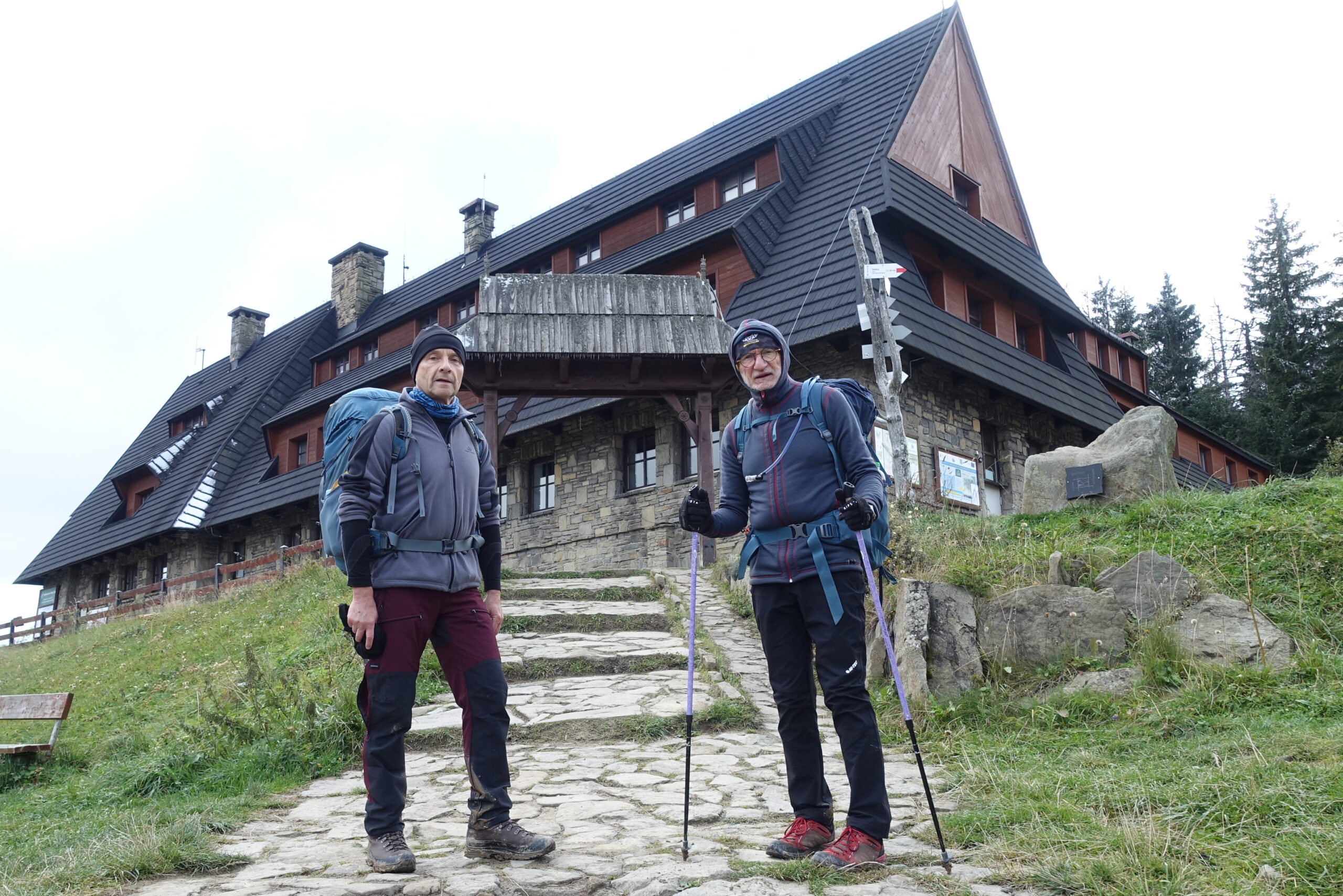 Przed nami najwyższe partie Beskidów z Babią Górą (1723 m) na czele, wyższe są jedynie Tatry. Jest początek października, a na szczycie Diablaka widać już śnieg. Przewidując taką pogodę, wzięliśmy ze sobą miniraczki. W „Agroturystyce nad Bystrzanką” w Bystrej Podhalańskiej miejsc brak, ale na hasło GSB Iza (szefowa) udostępniła nam pokój swojej córki. Była też kawa, była szarlotka, sympatyczny „przegadany” wieczór i poranek.